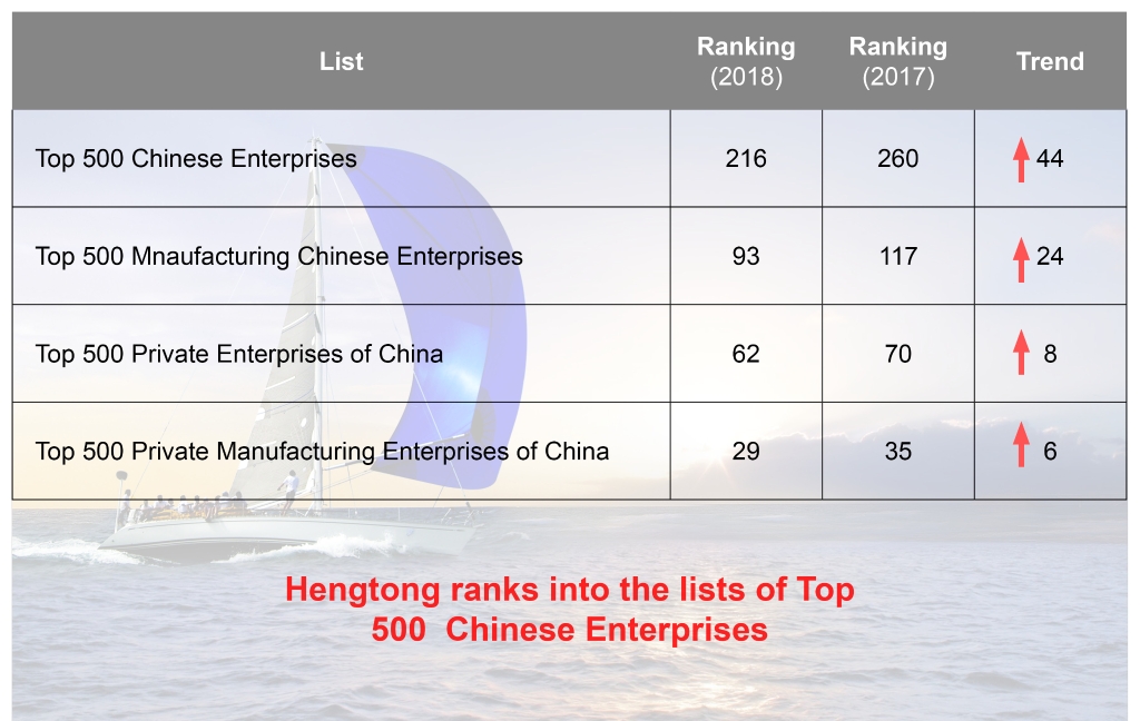 Hengtong ranked 216th in “Top 500 Chinese Enterprises” and 93rd in “Top 500 Manufacturing Chinese Enterprises” released by China Enterprise Federation in Xi’an; ranked 62nd in “Top 500 Private Enterprises of China”, and 29th in “Top 500 Private Manufacturing Enterprises of China” by China Federation of Industry and Commerce.