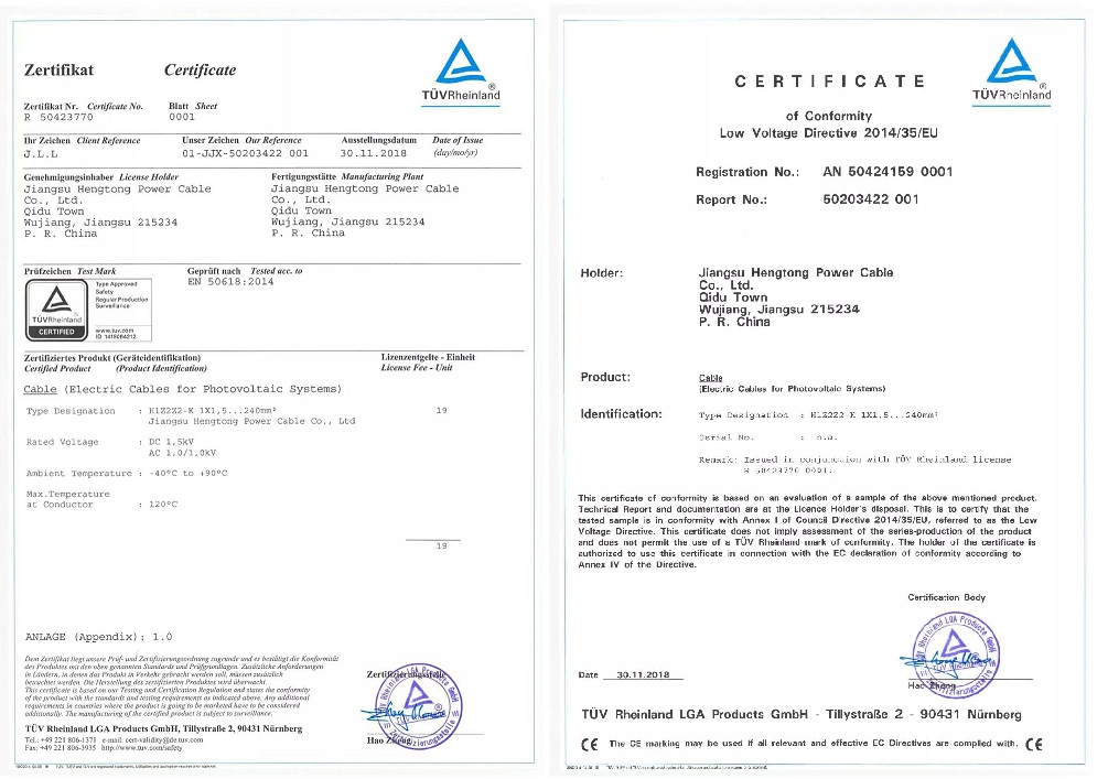 On 21st December, Hengtong’s H1Z2Z2-K solar system cable series products obtained the cable EU Standard EN50618 and CE certification issued by the TÜV Rheinland.